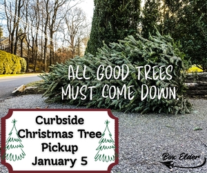 Curbside Christmas tree pickup will be one day only on January 5. Please have your tree at the curb by that morning, ready for its final journey.