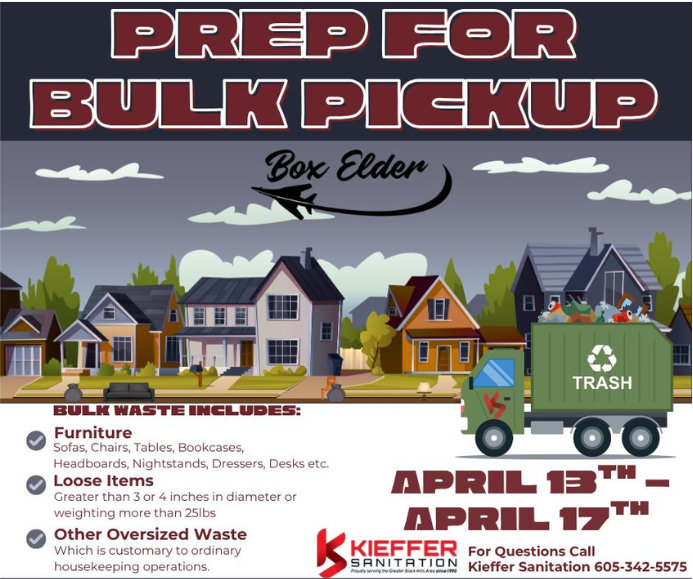 The City of Box Elder’s Bulk Pick-Up week is just around the corner, starting Monday, April 13th, to Friday, April 17th, and residents are encouraged to begin preparing items for curbside collection. To help ensure a smooth and efficient process for both residents and collection crews, please review the following guidelines.